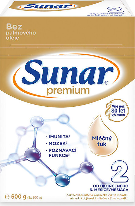 Pokračovací mléko Sunar Premium 2 je vhodné jako součást smíšené stravy pro děti od ukončeného 6. měsíce. Mléko je vyrobeno z čerstvého kravského mléka a smetany, neobsahuje palmový olej a je bez přidaných cukrů. V jeho složení se nalézá pouze mléčný cukr laktóza. Pro rozvoj mozku a sítnice je navýšen obsah DHA (omega 3). Obsažená prebiotická vláknina GOS napomáhá k dobrému trávení. Balení obsahuje 600 g.