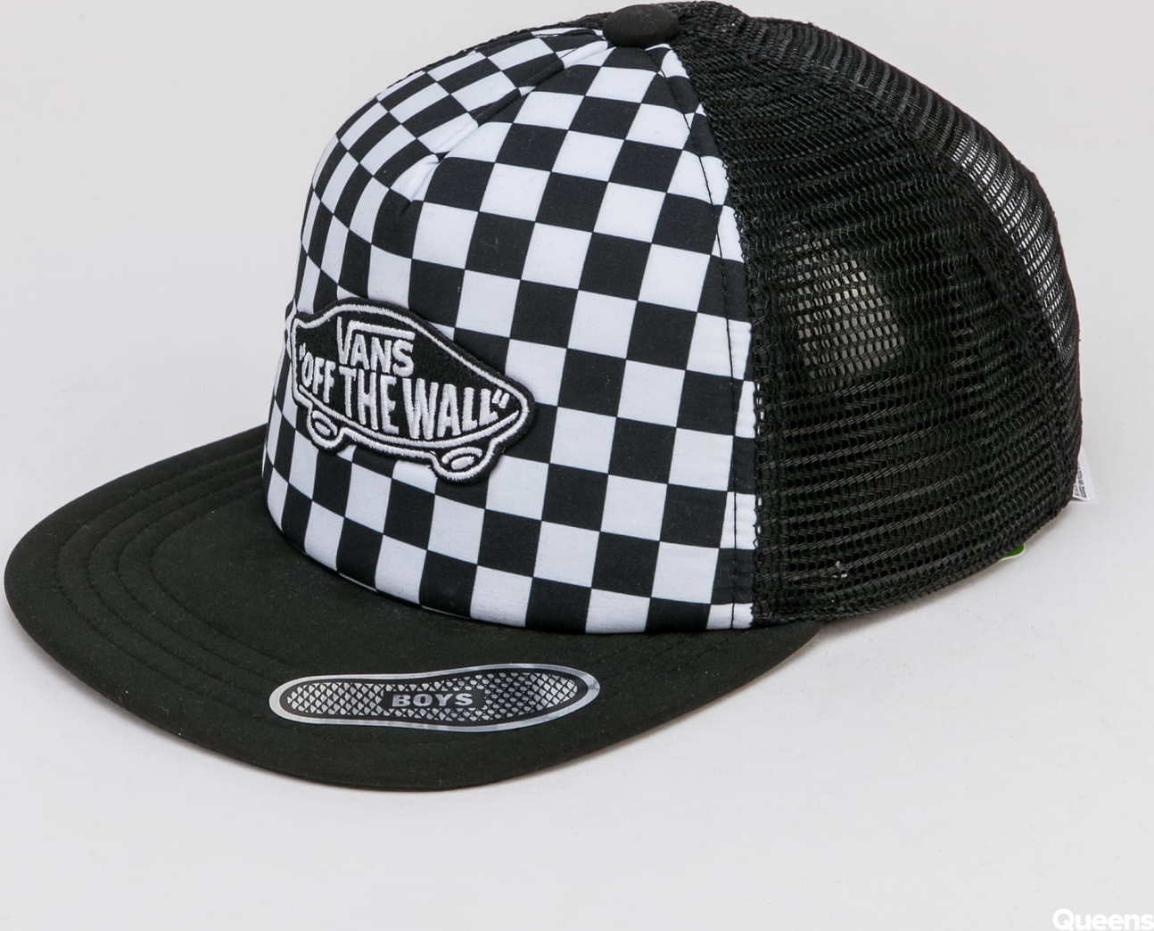 Černá trucker kšiltovka se zadním zapínáním a černou síťkou od značky Vans s černobílou přední části a logem.